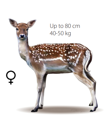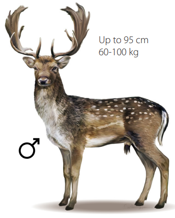 Fallow deer are a medium-sized deer species, with a highly variable coat colour. Their coat is predominantly fawn with some white spotting, or dark brown. The tail is black on top and white underneath, surrounded by a pale rump patch with a black outline. The tail is raised when alarmed. The upper portions of mature male antlers are flattened with numerous points. Adult bucks (males) stand around 90-95 cm at the shoulder and weigh 50-100 kg. Adult does (females) stand around 80-83 cm at the shoulder and weigh 35-55 kg. Males have a brush-like penile sheath, and a prominent 'Adam's Apple'. This species is often seen in large groups. Scats are stubby pellets, sometimes with a point at one end. The calls vary from high pitched bleating to deep grunts. They exhibit a long tail. As with all other deer species in Australia, females lack antlers.