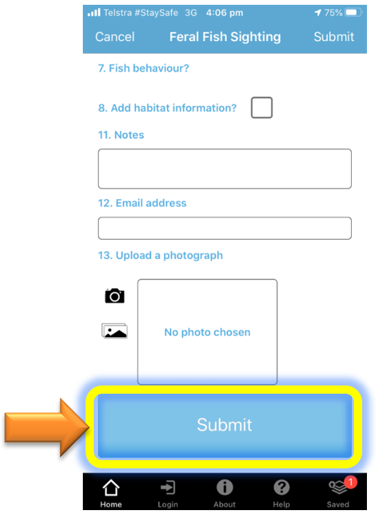 The FeralScan Pest Mapping App can help you to record information about feral fish, the problems they cause, or information about control activities. Information you record while using the App will display on the FeralFishScan map. The App can be downloaded onto your mobile device free-of-charge from the Apple App-Store or Google Play-store (links available on this website). We recommend you Login upon opening the App for the first time. The App works without internet connection or network coverage. The App stores records within the Saved Records folder in the App, until you are back within a mobile or WiFi network. You will need to open the folder to submit your records.
