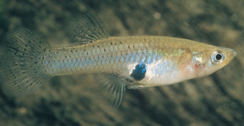 A small fish with a rounded tail, distinctly flattened head, upturned mouth and a single high dorsal fin well back on the body. Grows to 60mm. Females are much larger than males with a large, black blotch on their flanks. Gambusia are often seen in schools at the edges of the waterway or amongst freshwater plants.
